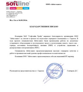 Компания ЗАО "Софтлайн Трейд" выражает благодарность организации ООО "Айти-манго" за участие в проекте по подготовке серверного помещения в г. Саратов.
